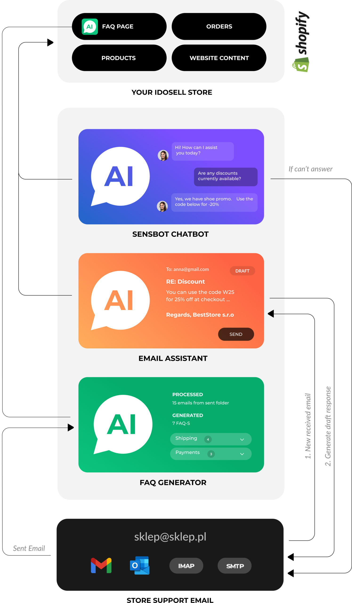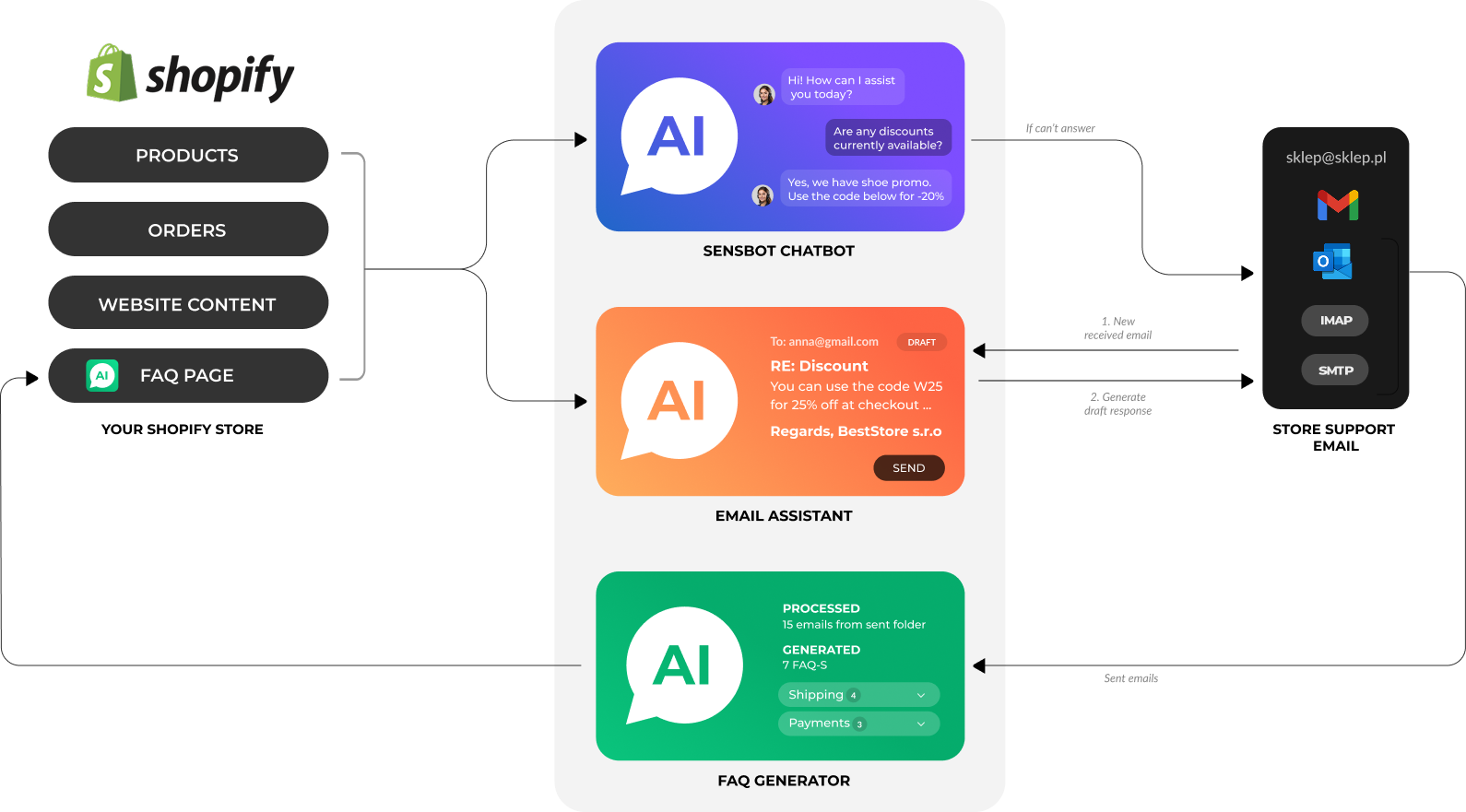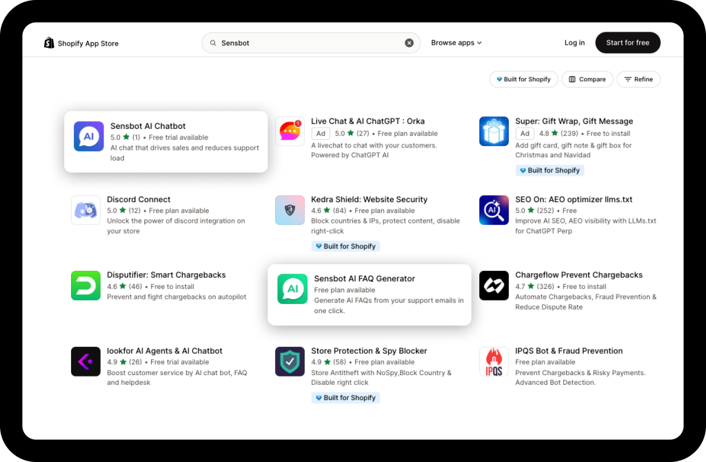 All three Sensbot apps are available on the Shopify App Store: Chatbot, FAQ Generator, and Email Assistant. Each app can be installed and used separately or together.